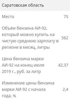 Саратовская область заняла в представленном списке 75-е место; в нашем регионе на среднемесячную зарплату можно купить только 562 литра АИ-92 (полгода назад - 72-е; 555 литров) с учетом июльской цены на него в 42,37 рубля. При этом с начала года данный вид топлива подорожал у нас на 2,4 процента.