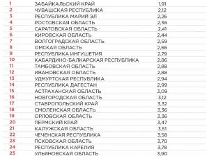 Первую пятерку скупердяев составили Забайкальский край (1,91 тысячи рублей на одного жителя), Чувашия (2,12 тысячи рублей), Марий Эл (2,26 тысячи рублей), Ростовская (2,36 тысячи рублей) и Саратовская (2,41 тысячи рублей) области.