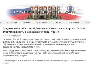 В Саратовской области собственники зданий и земельных участков будут нести персональную ответственность за содержание прилегающих к ним территорий. С таким предложением выступил сегодня, 3 мая, спикер регпарламента Иван Кузьмин.