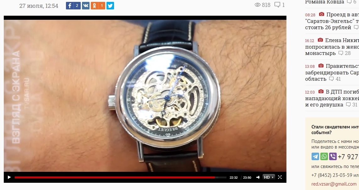Как пишет «ТВЗ», в очередном сюжете передачи «Взгляд с экрана», опубликованном сегодня каналом TVSAR, подчиненный Сергея Филипенко предстал перед журналистами «в совершенно, можно сказать, безобразном виде» - с дорогими швейцарскими часами Breguet Skeleton 3685 на руке. По оценке авторов телеграм-канала, ориентировочная стоимость подобной модели превышает 35 тысяч евро.