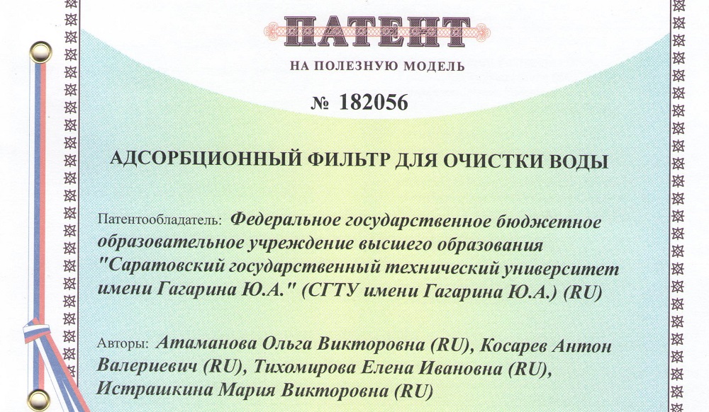 Ученые кафедры «Экология» Саратовского государственного технического университета имени Гагарина Ю.А. получили патент на «Адсорбционный фильтр для очистки воды».